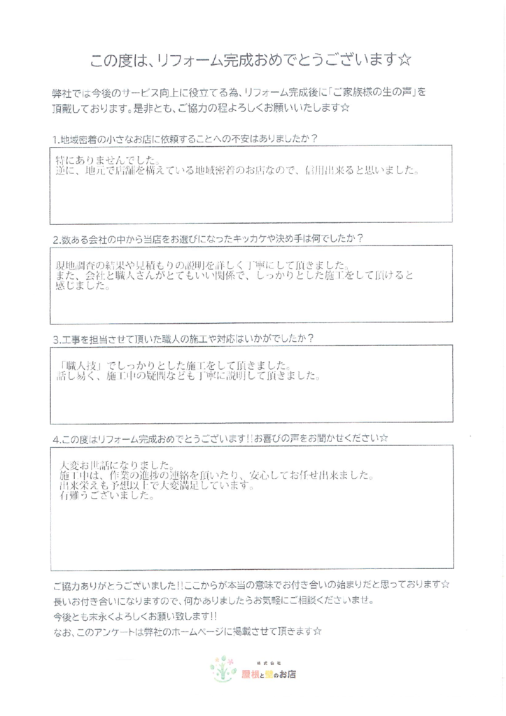 「大変お世話になりました。施工中は、作業の進捗の連絡を頂いたり、安心してお任せ出来ました。出来栄えも予想以上で大変満足しています。有難うございました。」