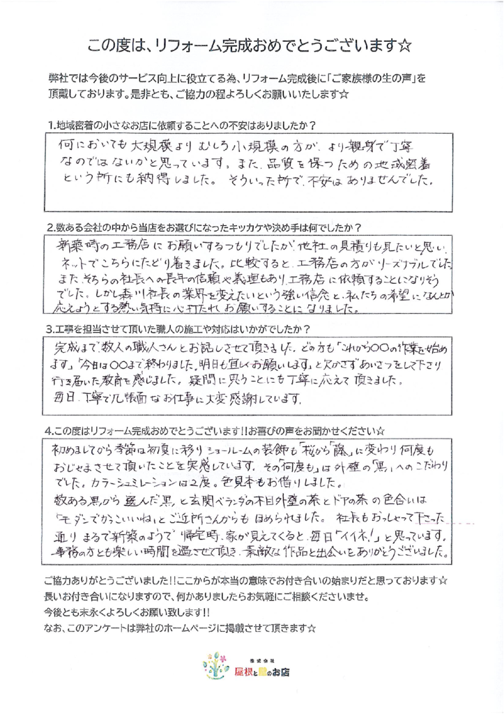 「初めましてから季節は初夏に移り、ショールームの装飾も「桜」から「藤」に変わり何度もおじゃまさせて頂いたことを実感しています。その「何度も」は外壁の「黒」へのこだわりでした。カラーシュミレーションは2度。色見本もお借りしました。数ある黒から選んだ黒と、玄関ベランダの木目外壁の茶とドアの茶の色合いは「モダンでかっこいいね」とご近所さんからもほめられました。社長もおっしゃって下さった通りまるで新築のようで、帰宅時 家が見えてくると毎日「イイネ!」と思っています。事務の方とも楽しい時間を過させて頂き、素敵な作品と出会いをありがとうございました。」
