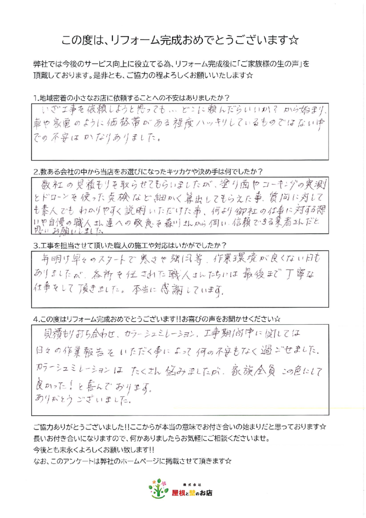 「見積もり打ち合わせ、カラーシュミレーション、工事期間中に関しては日々の作業報告をいただく事によって何の不安もなく過ごせました。カラーシュミレーションはたくさん悩みましたが、家族全員この色にして良かった!と喜んでおります。ありがとうございました。」