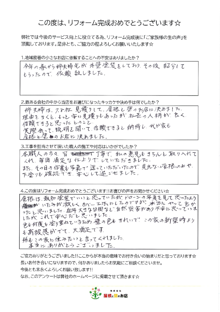 「屋根は、最初塗装でいいと思っていたが、ドローンの写真を見て思ったよりいたみが激しくカバー工法にしたのですが、本当にやって良かったと思いました。近年大きな台風など、自然災害があり不安に思っていましたが、これで安心だと思いました。色も何度も塗り重ねているため、壁の色もきれいで、この家の新築時よりも高級感がでて、大満足です。孫もこの家に住みたいと言ってくれました。本当にありがとうございました。」