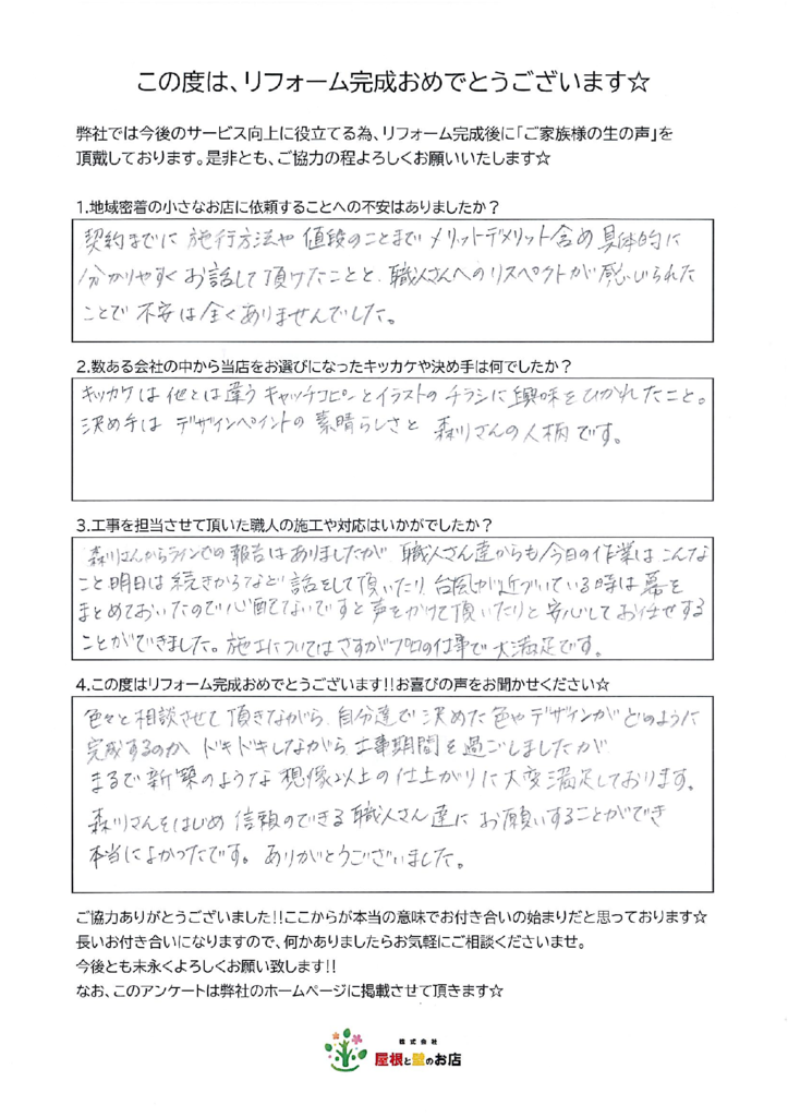 「色々と相談させて頂きながら、自分達で決めた色やデザインがどのように完成するのかドキドキしながら工事期間を過ごしましたが、まるで新築のような想像以上の仕上がりに大変満足しております。森川さんをはじめ信頼できる職人さん達にお願いすることができ本当によかったです。ありがとうございました。」