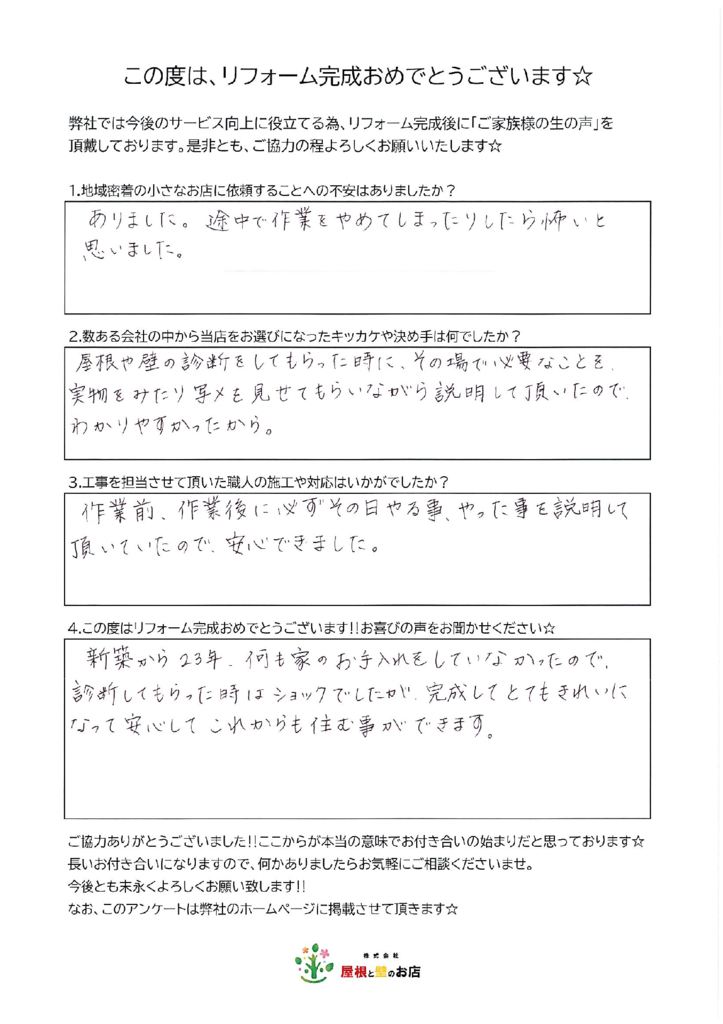 「新築から23年、何も家のお手入れをしていなかったので、診断してもらった時はショックでしたが、完成してとてもきれいになって安心してこれからも住む事ができます。」